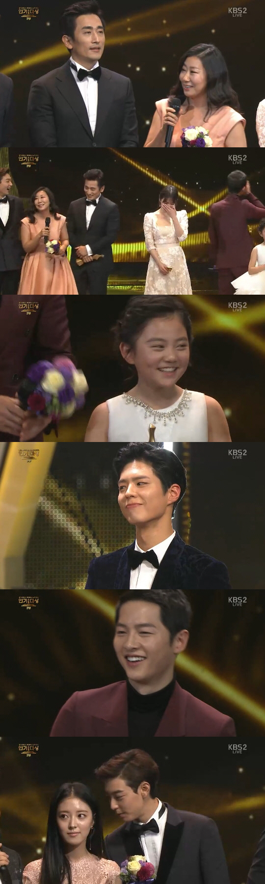 아시아 최고 커플상에 이어 2관왕에 오른 '송송커플' 송중기는 "송혜교 씨랑 내가 받는 것보다 라미란 선배님이 받으셔서 다행이다"라고 말해 웃음을 안겼다. 송혜교는 "저도 베스트 커플상 너무 받고 싶었는데 이렇게 받게 돼 기분 좋다. 또 좋아하는 분들과 함께 무대에 올라서 기분 좋다"고 밝혔다. 이어 송혜교는 남자로서 송중기 매력을 묻자 "많은 여성분들이 아시는 것처럼 드라마에서 보여준 것처럼 유머러스하고 똑똑하고 정의있고 부드러운 친구다"라고 극찬했다. 또 송중기는 송혜교의 매력에 대해 "모든 아시아인들이 아시겠지만 정말 아름답다. 정말 계산을 잘한다. 배우들과 스태프 사이에서 너무나 맛있는 밥 많이 사주셨다"고 재치있게 답했다.