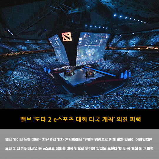 밸브 게이브 뉴웰 대표는 지난 9일 기자 간담회에서 "반이민명령으로 인해 비자 발급이 어려워지면 도타 2 디 인터내셔널 등 e스포츠 대회를 미국 밖으로 옮겨야 할지도 모른다"며 타국 개최 의견 피력