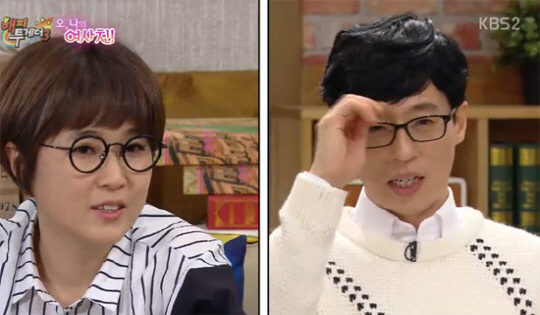 이어 "당시 신랑 신부 역할이었다. 제가 기습적으로 뽀뽀하는 신을 짜서 연습했다. 당시 유재석 씨가 정말 놀라서 두 번 정도 입을 벌리고 뽀뽀하기도 했다"고 고백해 유재석을 진땀나게 만들었다. 수 십 년 진정한 절친 사이가 아니면 방송에서 할 수 없는 화끈 고백.