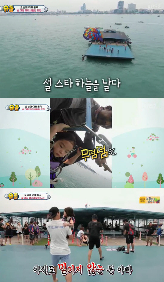 수아 설아 자매의 패러세일링 첫 도전에 가장 떨렸던 사람은 아빠 이동국. 아이들이 "아빠와 따로 탈 것"이라고 선언한 뒤 의외로 울지 않고 상공을 담담히 날았다. 착륙할 때는 손을 흔드는 여유까지 보였다.