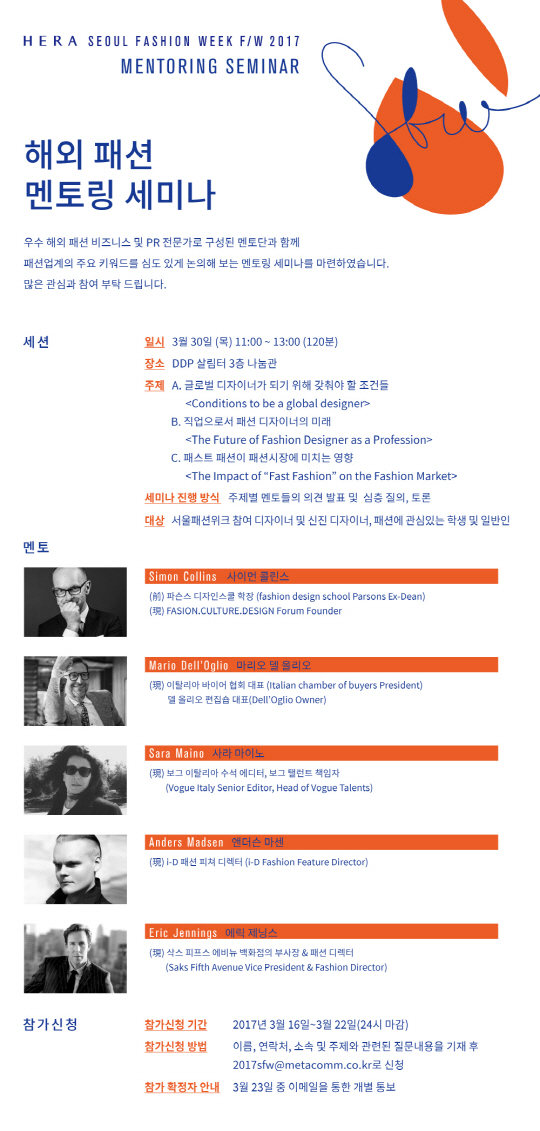 이번 세미나는 2017 F/W 헤라서울패션위크 프로그램 일환으로 우수 해외 패션 비즈니스 및 PR 전문 멘토 초청 공개 세미나다. '글로벌 디자이너가 되기 위해 갖춰야 할 조건들''직업으로서 패션디자이너의 미래''패스트 패션이 패션시장에 미치는 영향' 등 세 가지 주제의 멘토 스피치 후 자유로운 토론으로 진행된다.