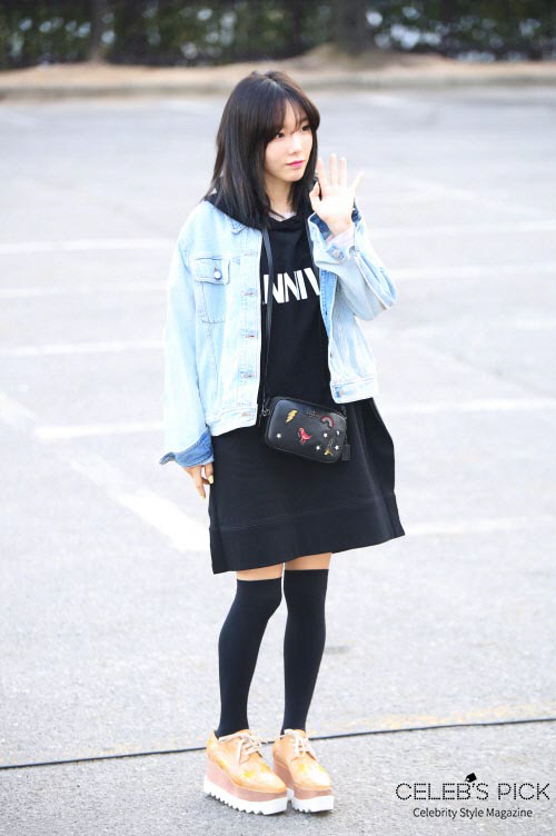 태연은 가장 기본적인 형태의 데님 재킷을 착용했다. 적당히 빠진 워싱과 깔끔한 디테일이 자연스러우면서도 편한 이미지를 완성해준다. 하지만 데님 재킷 특유의 빳빳한 소재감과 거친 느낌 대신 얇고 부드럽게 제작되어 셔츠 같은 분위기를 연출할 수도 있다. MM6 제품.