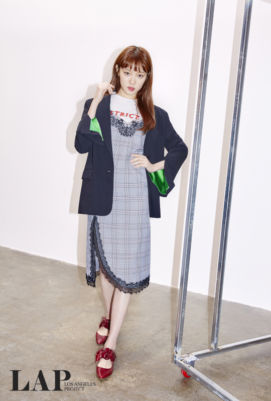 또한 이번시즌 트렌드를 잘 반영한 스타일링도 선보였다. 글랜 체크 자켓과 플라워 슬리브리스 원피스를 매치해 클래식한 무드에 여성스러움이 돋보이도록 연출했으며, 매니쉬한 라인의 네이비 자켓은 캐쥬얼 티셔츠에 글랜체크 슬리브리스와 스타일링하여 이성경만의 상큼한 매력을 표현했다.