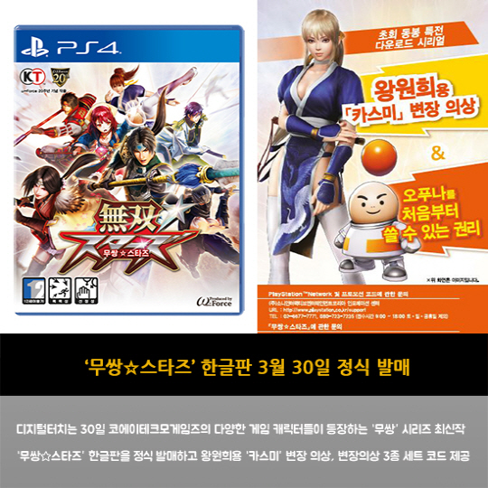 디지털터치는 30일 코에이테크모게임즈의 다양한 게임 캐릭터들이 등장하는 '무쌍' 시리즈 최신작 '무쌍☆스타즈' 한글판을 정식 발매하고 왕원희용 '카스미' 변장 의상, 변장의상 3종 세트 코드 제공