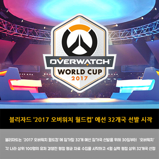 블리자드는 '2017 오버워치 월드컵'에 참가할 32개 예선 참가국 선발을 위해 30일부터 '오버워치' 각 나라 상위 100명의 유저 경쟁전 평점 평균 자료 수집을 시작하고 4월 실력 평점 상위 32개국 선정