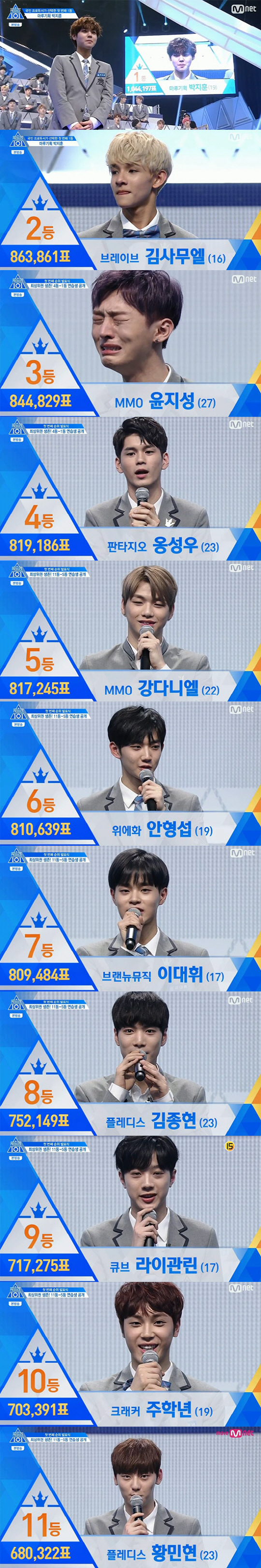 1등 마루기획 박지훈. 2등 브레이브 김사무엘. 3등 MMO 윤지성. 4등 판타지오 옹성우. 5등 MMO 강다니엘. 6등 위에화 안형섭. 7등 브랜뉴뮤직 이대휘. 8등 플레디스 김종현. 9등 큐브 라이관린. 10등 크래커 주학년. 11등 플레디스 황민현.