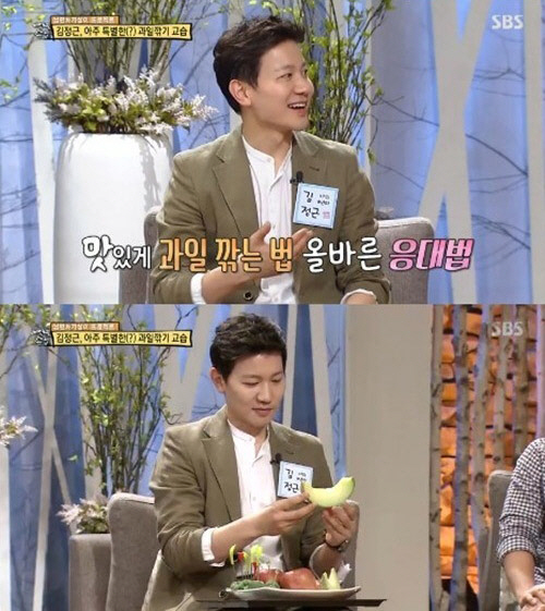 이날 MC 김원희는 "김정근 씨가 처가에서 과일을 깎는다고 하던데"라고 입을 열었고, 이에 김정근은 "처음에 제가 손도 빠르고, 잘 깎는다고 했다. 근데 깎으니까 만족하시더라"라고 설명했다.
