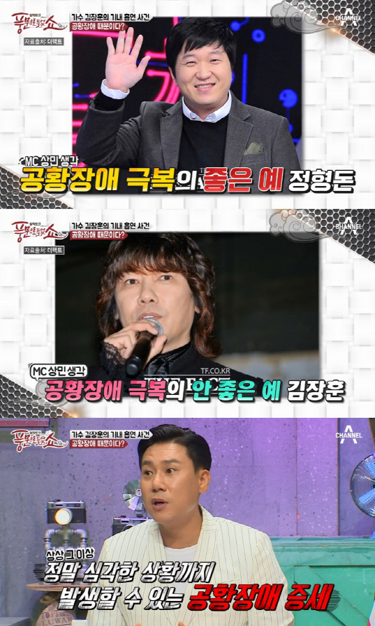 이를 들은 MC 이상민은 "공황장애 극복의 좋은 예는 정형돈이고, 안 좋은 예가 김장훈 같다"고 말했다. 이어 "정형돈은 스스로가 휴식기를 선언하고, 개인적으로 치료를 위해 생활하면서 치료에 전념했다. 하지만 김장훈은 치료보다는 본인이 해야 할 일을 하기 위해 움직이다 보니까 스트레스가 쌓인 거 같고, 결국 그런 일이 발생한 것"이라며 안타까워했다. <스포츠조선닷컴>