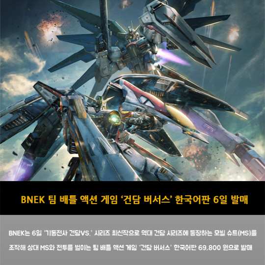 BNEK는 6잃 '기동전사 건담VS.' 시리즈 최신작으로 역대 건담 시리즈에 등장하는 모빌 슈트(MS)를 조작해 상대 MS와 전투를 벌이는 팀 배틀 액션 게임 '건담 버서스' 한국어판 69,800 원으로 발매
