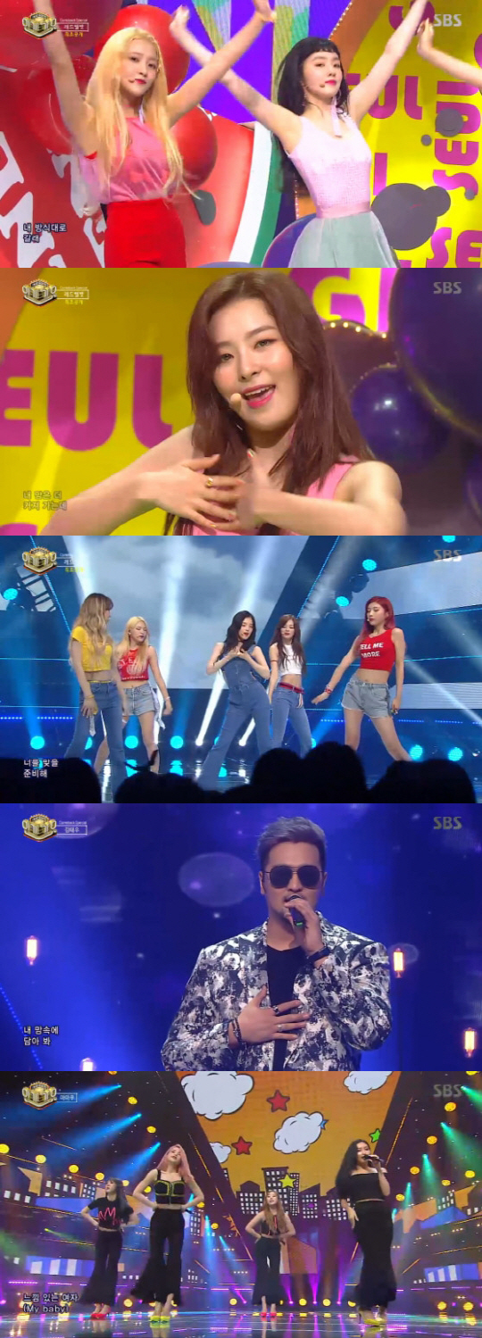 레드벨벳은 이날 12시에 신곡 음원을 공개하자마자 '인기가요'에서 방송 무대를 최초로 공개했다. 시원한 여름과 잘 어울리는 레드벨벳 특유의 상큼발랄한 매력이 돋보이는 신곡 '빨간 맛'과 밝고 시원한 일렉트로닉 팝 곡 'You Better know'로 눈과 귀를 사로잡았다. '명품 보컬' 김태우는 시원한 사이다같은 가창력과 한층 깊어진 소울로 특유의 감성을 표현한 '따라가'로 화려한 무대를 꾸몄다.
