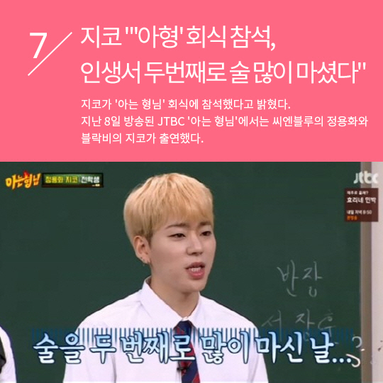 7위 : 지코 "'아형' 회식 참석, 인생서 두번째로 술 많이 마셨다" (기사링크 :/news/ntype.htm?id=201707090100075060005521&servicedate=20170708)