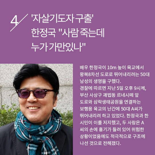 4위 : [직격인터뷰] '자살기도자 구출' 한정국 "사람 죽는데 누가 가만있나" (기사링크 :/news/ntype.htm?id=201707070100056360004031&servicedate=20170706)