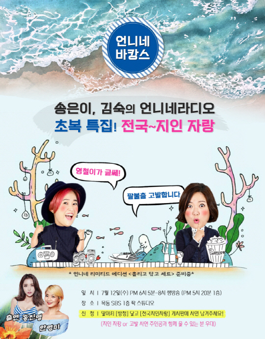 SBS 러브FM '송은이 김숙의 언니네 라디오'가 무더위를 시원하게 날려버릴 초복 특집 공개 방송으로 청취자들을 찾아간다.