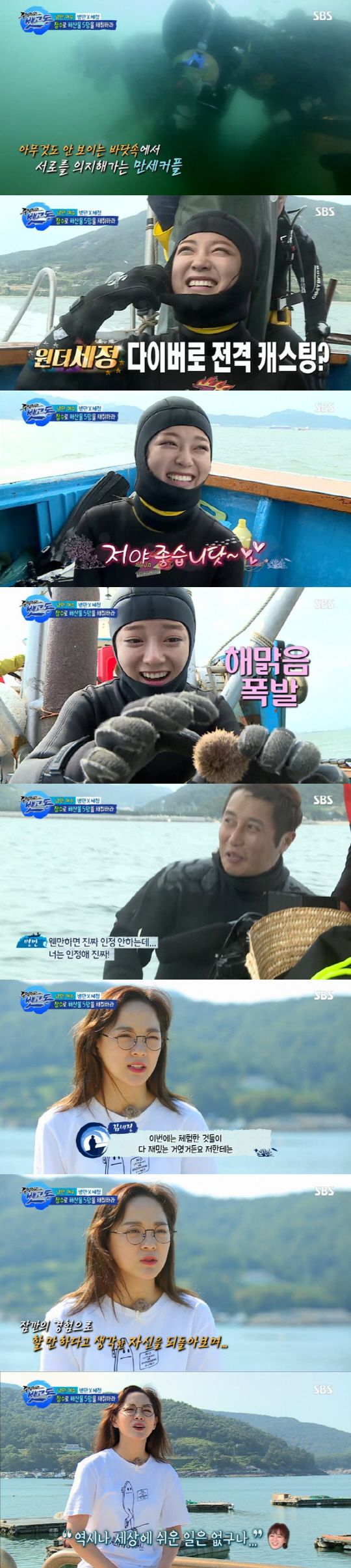 잠수 조업을 처음 해보는 김세정은 이 날 방송에서 두려워하면서도 도전을 포기하지 않는 '원더 세정'의 모습을 보여 모두를 놀라게 했다. 김병만은 김세정에게 "그 시야에서 웬만한 사람은 패닉이다. 웬만하면 인정 안 하는데 너는 진짜 인정한다"라며 무한 칭찬을 했을 정도.