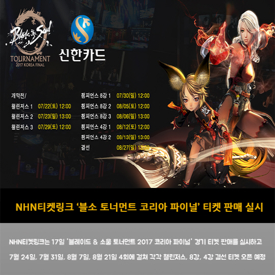 NHN티켓링크는 17일 '블레이드 & 소울 토너먼트 2017 코리아 파이널' 경기 티켓 판매를 실시하고 7월 24일, 7월 31일, 8월 7일, 8월 21일 4회에 걸쳐 각각 챌린저스, 8강, 4강 결선 티켓 오픈 예정