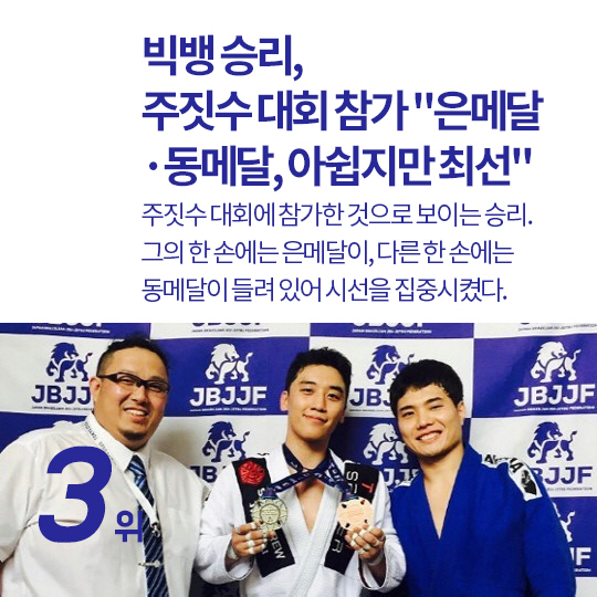 3위 : 빅뱅 승리, 주짓수 대회 참가…"은메달·동메달, 아쉽지만 최선" ☞ <a href='/news/ntype.htm?id=201707180100159550011658&servicedate=20170717"><b>기사보러가기</b></a>