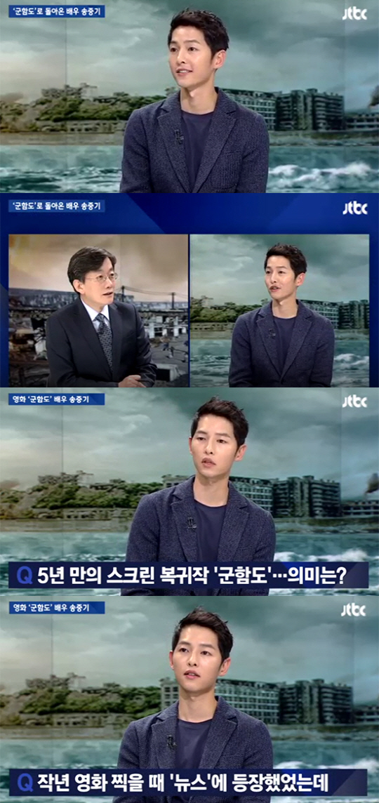 '군함도' 속 조선인들이 촛불을 들어올리는 장면 관련 질문에 송중기는 "그 장면을 촬영한 날 서울에서는 실제로 촛불집회를 하고 있었다"고 말했다. 손 앵커는 "그런 장면이라든가 몇몇 얘기들 때문에 영화평 별점 테러도 있다고 들었다"고 언급했다. 송중기는 "그런 의견도 존중해야 한다. 대중문화의 매력이 아닐까라는 생각도 든다"고 말했다.