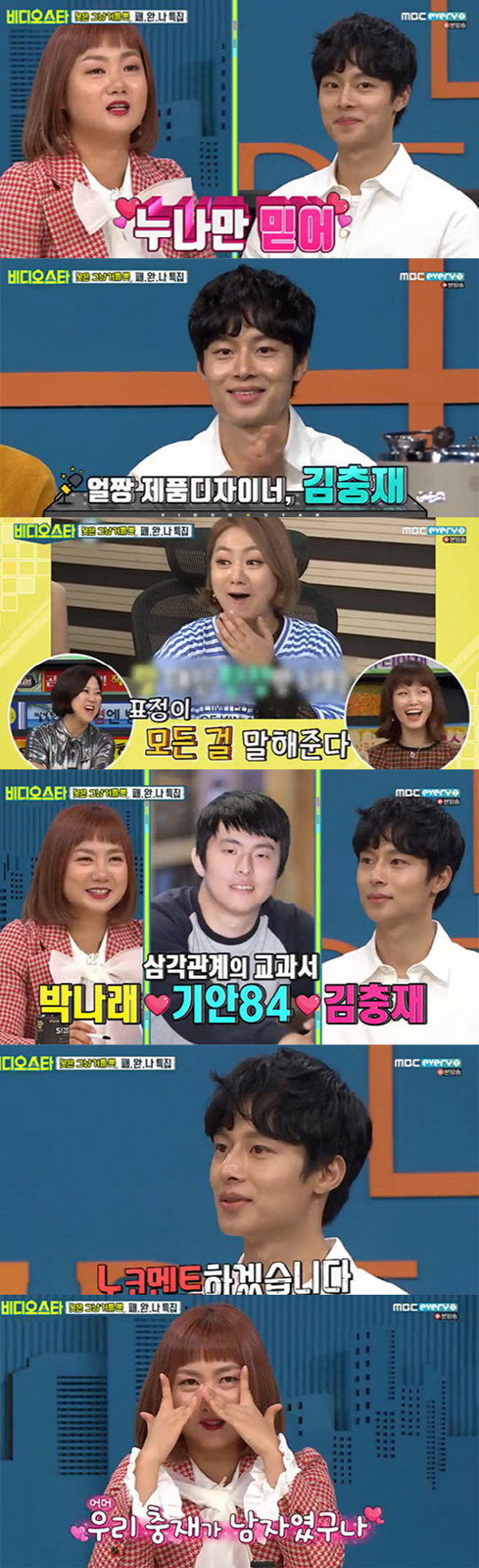 김숙은 "'나 혼자'에서 기안84, 박나래와 묘한 삼각관계를 보여줬다. 여기에 앞서 '비스'에 출연한 김동현 씨 포함해 사각관계가 됐다"고 말했다. "이를 어떻게 생각하냐"는 질문에 김충재는 "신경 쓰인다"고 대답해 박나래 마음을 설레게 했다. 김숙은 다시 "승부욕도 생기냐"고 질문, 김충재는 "노코멘트 하겠다"고 답하며 궁금증을 유발했다.