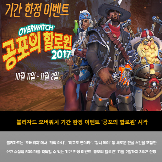 블리자드는 '오버워치'에서 '해적 아나', '이교도 젠야타', '강시 메이' 등 새로운 전설 스킨을 포함한 신규 수집품 50여개를 획득할 수 있는 기간 한정 이벤트 '공포의 할로윈' 11월 2일까지 3주간 진행