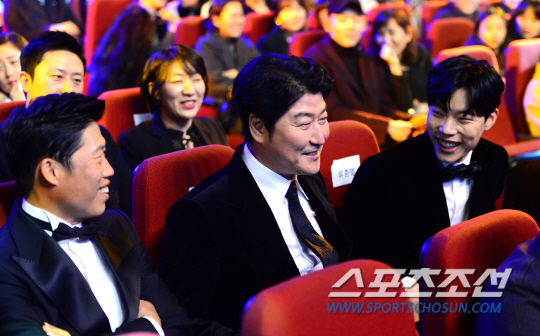 25일 오후 서울 동대문구 회기동 경희대학교 평화의 전당에서 제38회 '청룡영화상'이 열렸다. 시상식에 참석한 유해진, 송강호, 류준열이 대화를 나누고 있다. 송정헌 기자 songs@sportschosun.com/2017.11.25 |