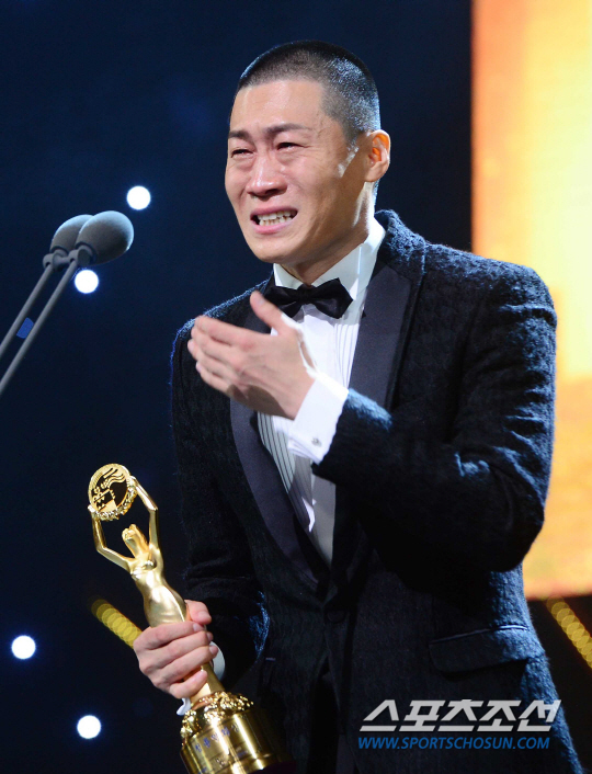 25일 오후 서울 동대문구 회기동 경희대학교 평화의 전당에서 제38회 '청룡영화상'이 열렸다. 남우조연상을 수상한 '범죄도시' 진선규가 감격의 눈물을 흘리고 있다. 김경민 기자 kyungmin@sportschosun.com/2017.11.25/ |