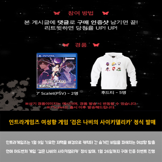 인트라게임즈는 1월 9일 기묘한 저택을 배경으로 캐릭터 간 숨겨진 비밀을 파헤치는 여성향 탈출 연애 어드벤처 게임 '검은 나비의 사이키델리카' 정식 발매, 1월 26일까지 구매 인증 이벤트 진행