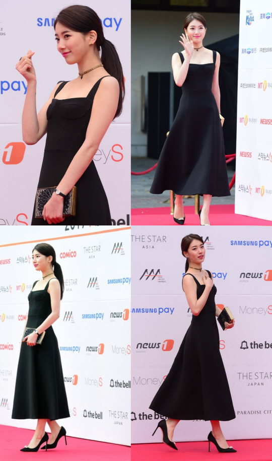 #04 블랙의 정점, 레드카펫 수지의 블랙 스타일 중 베스트로 꼽히는 이 날. 시상식 레드카펫이라 그런지 가장 로맨틱하면서도 깔끔하게 정제된 스타일이 여럿의 마음을 훔쳤다. 과감하게 드러난 네크라인과 몸매를 따라 유려하게 흐르는 실루엣의 드레스를 훌륭하게 소화했다.