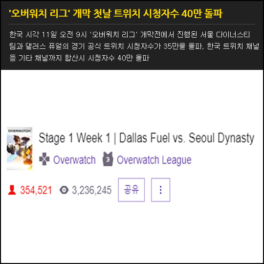 한국 시각 11일 오전 9시 '오버워치 리그' 개막전에서 진행된 서울 다이너스티 팀과 댈러스 퓨얼의 경기 공식 트위치 시청자수가 35만을 돌파했고 한국 트위치 채널 등 기타 채널까지 합산시 시청자수 40만 돌파