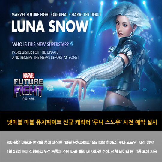 넷마블은 마블과 협업을 통해 제작한 '마블 퓨처파이트' 오리지널 히어로 '루나 스노우' 사전 예약 1월 23일까지 진행하고 누적 등록자 수에 따라 게임 내 재화인 수정, 생체 데이터 등 각종 보상 지급