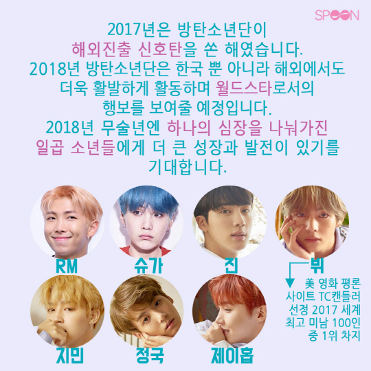 방탄소년단은 지난해부터 국내외를 아우르는 인기를 얻으며 세계적 케이팝 스타로 성장했습니다. 영어 번안곡이 아닌 한국어 가사 그대로인 곡으로 해외 팬들을 사로잡으며 신드롬을 일으켰습니다. 미국 빌보드차트 중 하나인 '빌보드200'에서 '러브 유어셀프 승 허'는 14주 동안 차트를 지켰고, 한국 가수 최초로 아메리칸 뮤직 어워드 무대를 장식하기도 했습니다. 2017년 해외진출 신호탄을 터트렸다면 2018년은 월드스타로 자리매김하는 해가 될 것으로 보입니다. 지난해에 이어 올해도 '꽃길 정주행' 중인 BTS. 연초부터 팬들을 후끈 달아오르게 하는 일곱 소년들의 남다른 행보를 살펴보았습니다.
