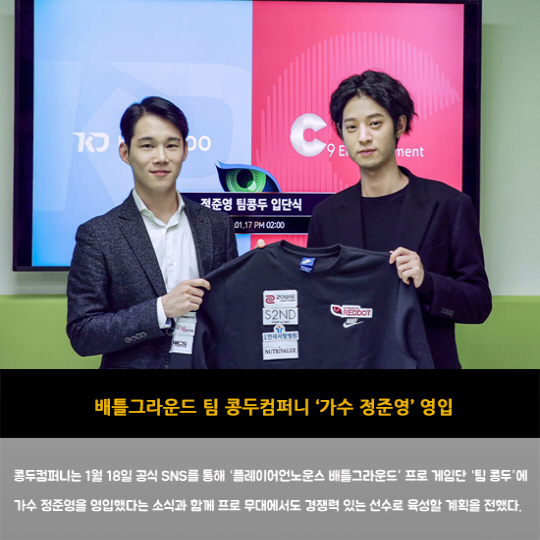 콩두컴퍼니는 1월 18일 공식 SNS를 통해 '플레이어언노운스 배틀그라운드' 프로 게임단 '팀 콩두'에 가수 정준영을 영입했다는 소식과 함께 프로 무대에서도 경쟁력 있는 선수로 육성할 계획을 전했다.