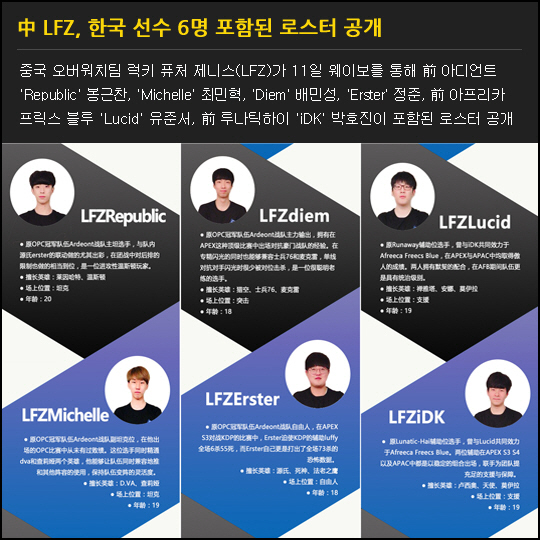 중국 오버워치팀 럭키 퓨처 제니스(LFZ)가 11일 웨이보를 통해 前 아디언트 'Republic' 봉근찬, 'Michelle' 최민혁, 'Diem' 배민성, 'Erster' 정준, 前 아프리카 프릭스 블루 'Lucid' 유준서, 前 루나틱하이 'iDK' 박호진이 포함된 로스터 공개