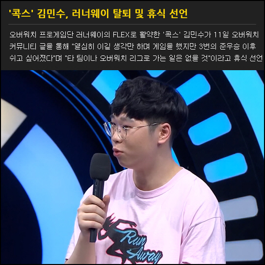 오버워치 프로게임단 러너웨이의 FLEX로 활약한 '콕스' 김민수가 11일 오버워치 커뮤니티 글을 통해 "열심히 이길 생각만 하며 게임을 했지만 3번의 준우승 이후 쉬고 싶어졌다"며 "타 팀이나 오버워치 리그로 가는 일은 없을 것"이라고 휴식 선언
