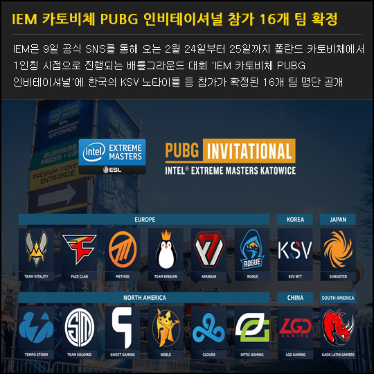 IEM은 9일 공식 SNS를 통해 오는 2월 24일부터 25일까지 폴란드 카토비체에서 1인칭 시점으로 진행되는 배틀그라운드 대회 'IEM 카토비체 PUBG 인비테이셔널'에 한국의 KSV 노타이틀 등 참가가 확정된 16개 팀 명단 공개