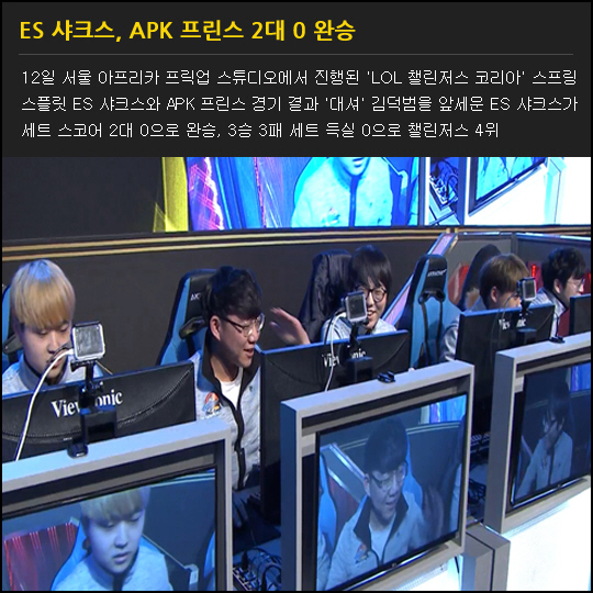 12일 서울 아프리카 프릭업 스튜디오에서 진행된 'LOL 챌린저스 코리아' 스프링 스플릿 ES 샤크스와 APK 프린스 경기 결과 '대셔' 김덕범을 앞세운 ES 샤크스가 세트 스코어 2대 0으로 완승, 3승 3패 세트 득실 0으로 챌린저스 4위