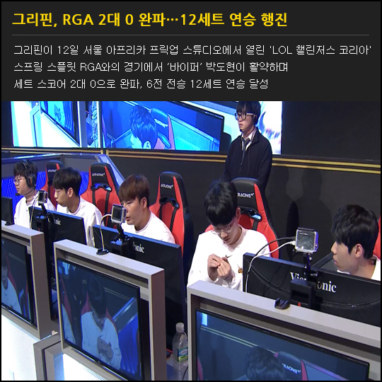 그리핀이 12일 서울 아프리카 프릭업 스튜디오에서 열린 'LOL 챌린저스 코리아' 스프링 스플릿 RGA와의 경기에서 '바이퍼' 박도현이 활약하며 세트 스코어 2대 0으로 완파, 6전 전승 12세트 연승 달성