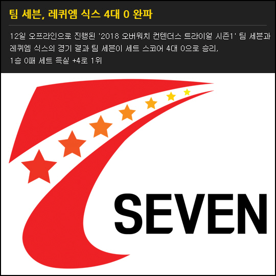 12일 오프라인으로 진행된 '2018 오버워치 컨텐더스 트라이얼 시즌1' 팀 세븐과 레퀴엠 식스의 경기 결과 팀 세븐이 세트 스코어 4대 0으로 승리, 1승 0패 세트 득실 +4로 1위