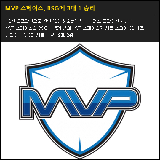 12일 오프라인으로 열린 '2018 오버워치 컨텐더스 트라이얼 시즌1' MVP 스페이스와 BSG의 경기 결과 MVP 스페이스가 세트 스코어 3대 1로 승리해 1승 0패 세트 득실 +2로 2위