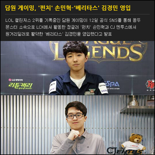 LOL 챌린저스 2위를 기록중인 담원 게이밍이 12일 공식 SNS를 통해 콩두 몬스터 소속으로 LCK에서 활동한 정글러 '펀치' 손민혁과 CJ 엔투스에서 원거리딜러로 활약한 '베리타스' 김경민을 영입했다고 발표
