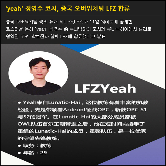 중국 오버워치팀 럭키 퓨처 제니스(LFZ)가 11일 웨이보에 공개한 로스터를 통해 'yeah' 정영수 前 루나틱하이 코치가 루나틱하이에서 힐러로 활약한 'iDK' 박호진과 함께 LFZ에 합류했다고 발표