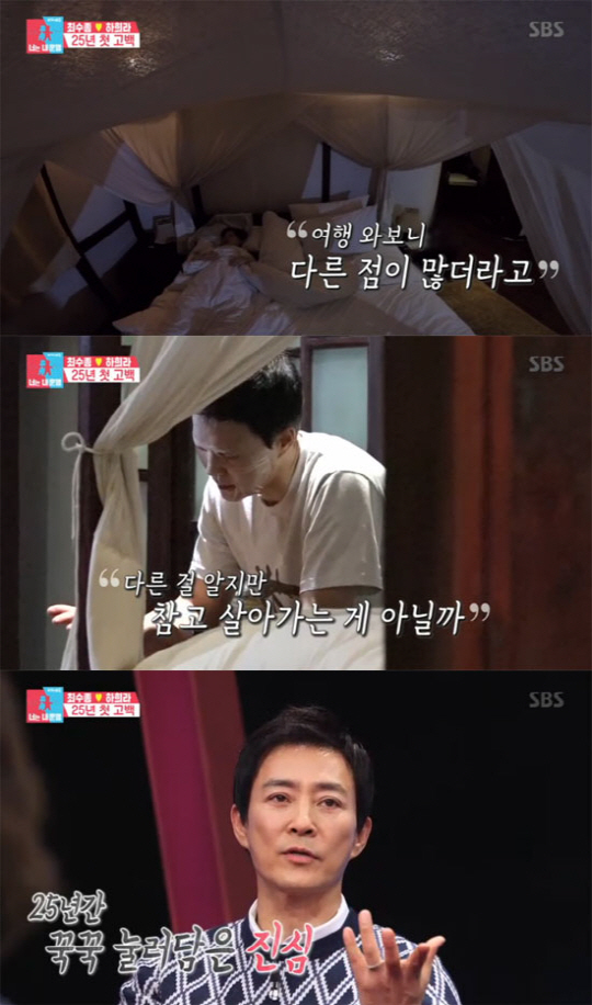먼저 자리에 누운 하희라는 ""오늘 수고 많았어. 내가 하고 싶은거 다 하게 해줘서 고마워"라며 "25년간 몰랐는데 여행을 와보니 우리가 다르다는 것을 알게 됐다"고 이야기 했다. 이에 최수종은 "모든 게 다른데 하나로 맞춰가려고 노력하는 거 아니냐"며 얘기를 이어나갔다. 하지만 최수종의 말에도 하희라는 묵묵부답이었고, 먼저 잠자리에 든 것. 최수종은 잠든 하희라를 향해 "사랑합니다"는 고백을 했다.
