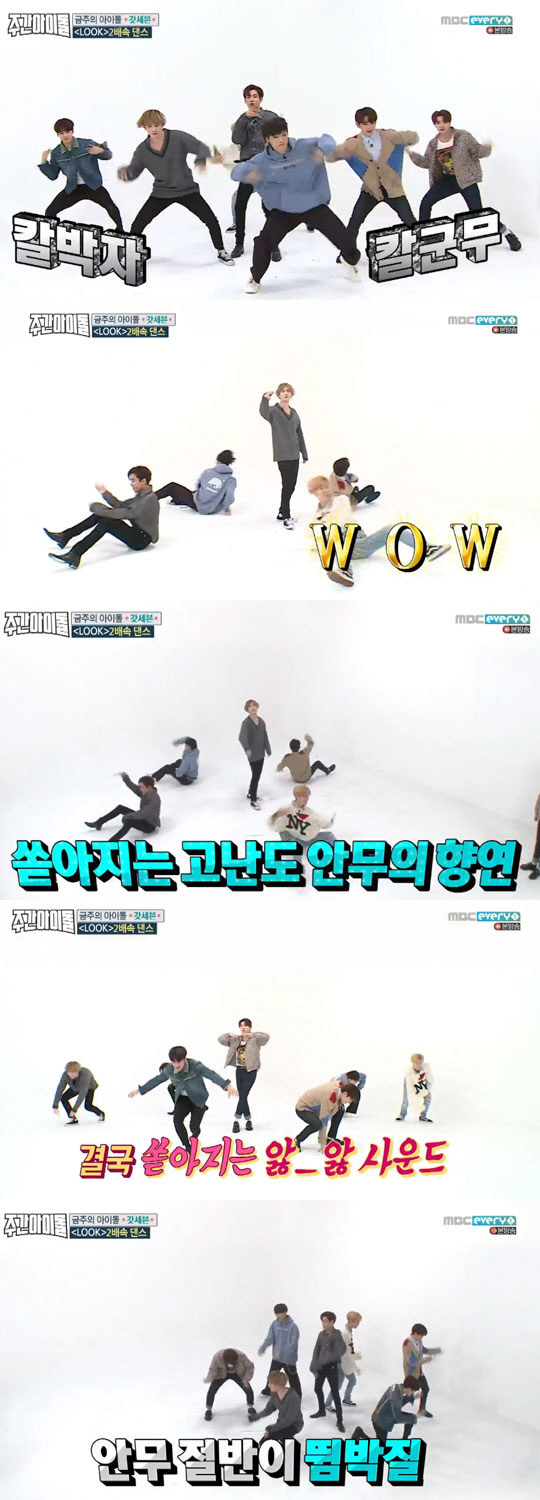 [스포츠조선 김영록 기자]'주간아이돌' 갓세븐이 2배속 댄스에 성공했다. 노래가 끝나자 그대로 주저앉을 만큼 강렬한 댄스가 돋보였다.