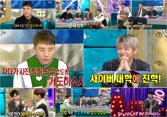 그런 승리의 폭주기관차 같은 입담은 방송 초반부터 시작됐다. 그는 빅뱅 멤버들이 모두 군대를 가 "참 살맛 납니다"라면서 어차피 돌아올 멤버들이기에 그리워하지 않는다며 현재 자신에게 초 집중 된 소속사의 환경을 만끽하고 있음을 드러내 웃음을 터트리게 했다. 승리는 지난 '라디오스타' 출연 당시 1개였던 라면집이 35개로 늘어났음을 얘기하면서 가맹점주와 자신이 50대 50으로 투자한다는 남다른 철학을 공개했는데 "너 반, 나 반, 망해도 나한테 뭐라 하지마"라는 말로 마무리해 일동 모두 물개 박수를 치게 했다.