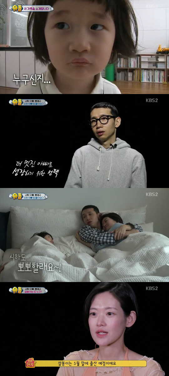 이날 봉태규-시하 부자가 정식 합류했다. 시하는 잠투정 없이 혼자 일어나 거실로 나와 처음 본 카메라를 향해 정중하게 인사했다. 이어 수준급의 다도 예절을 자랑하며 장난감 차를 카메라 삼촌들에게 대접했다. 또 시하는 집안 곳곳을 활보하며 모닝 체조를 하는 엉뚱한 매력을 발산했다. 상쾌하게 아침을 시작한 시하는 잠꾸러기 엄마-아빠를 깨우는 등 누구보다 부지런한 모습으로 눈길을 끌었다.