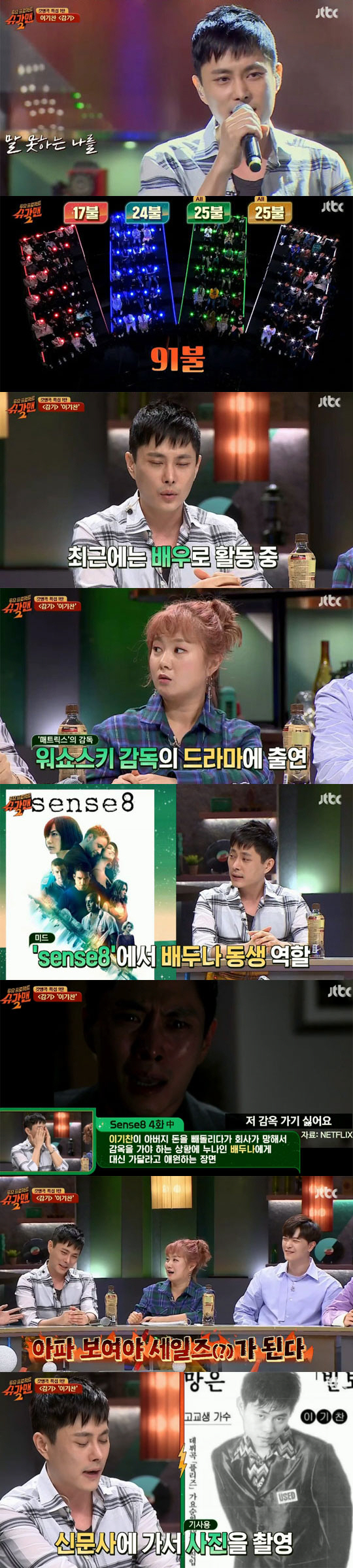 이기찬은 최근 가수가 아니라 배우로 활동중인 근황을 전했다. 이기찬은 "오디션을 통해 워쇼스키 감독의 미국 드라마 '센스8'에 출연했다. 배두나씨 동생 역"이라고 설명했다. 이기찬은 '감기'에 대해 "절 저작권 협회 정회원으로 만들어준 곡"이라는 애정을 드러냈다. 유재석은 "저도 '압구정날라리' 덕분에 일반 회원이 됐다. 지난달에 저작권료가 330원 들어왔더라"고 웃었다.