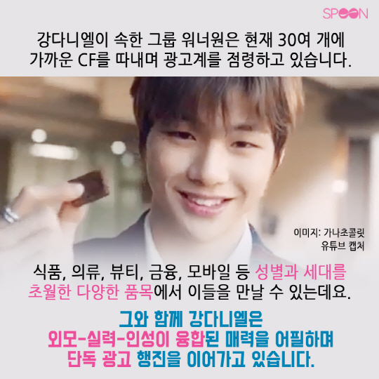2018년 대세 스타 강다니엘. 남자 CF 모델 브랜드 평판에서도 늘 1~3위권을 유지하며 식지 않는 인기를 입증하고 있습니다. 그가 속한 그룹 워너원은 폭넓은 팬층을 확보하며 데뷔 10개월 만에 30여 개에 가까운 CF를 따냈습니다. 이와 함께 강다니엘은 외모-실력-인성이 융합된 매력으로 광고주들의 마음을 사로잡고 있는데요. 그동안 강다니엘이 '완판 부르는 미소'로 팬심을 녹인 단독 CF 5편을 살펴보았습니다.