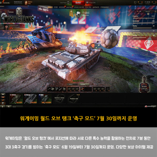 워게이밍은 '월드 오브 탱크'에서 포지션에 따라 서로 다른 특수 능력을 활용하는 전차로 7분 동안 3대 3축구 경기를 벌이는 '축구 모드' 6월 19일부터 7월 30일까지 운영, 다양한 보상 아이템 제공