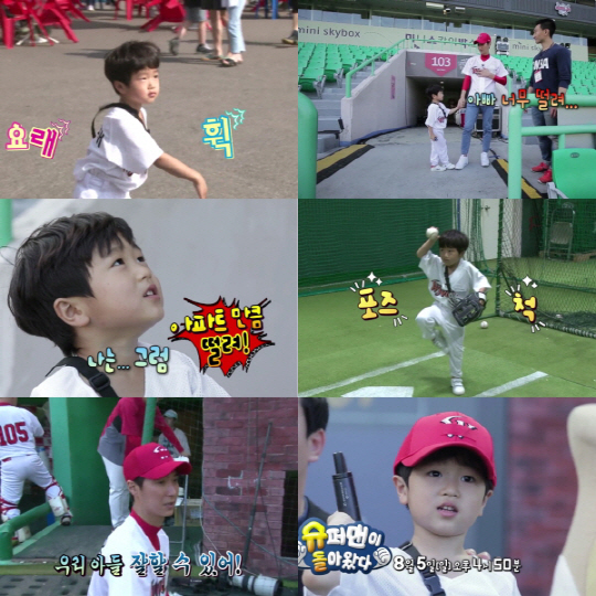 '해피선데이-슈퍼맨이 돌아왔다'에서는 고지용-고승재 부자가 야구장을 찾은 모습이 공개된다. 구단 관계자를 만나 "오늘 왜 야구장에 왔냐"라는 질문을 들은 승재는 "애국가를 부르러 왔다. 아파트만큼 떨린다"라고 고백한다. 이어 시구 연습에 돌입한 승재는 '취권'의 이소룡을 연상시키는 시구 자세와 독창적인 글러브 시구를 보여주며 웃음을 안긴다.
