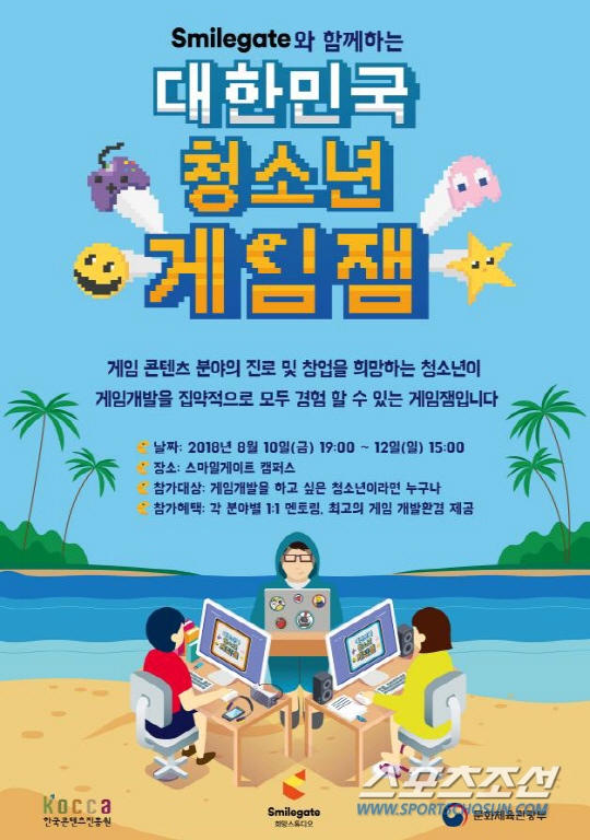 문화체육관광부와 한국콘텐츠진흥원은 스마일게이트 희망스튜디오와 함께 오는 10일부터 12일까지 경기 성남시 판교 스마일게이트 캠퍼스에서 '2018 대한민국 청소년 게임잼'을 개최한다. '게임잼(Game Jam)'이란 개발과 디자인, 기획 등 게임 분야에 재능이 있는 사람들이 즉흥적으로 팀을 이뤄 정해진 시간 내 시제품 단계의 게임을 만드는 행사다.