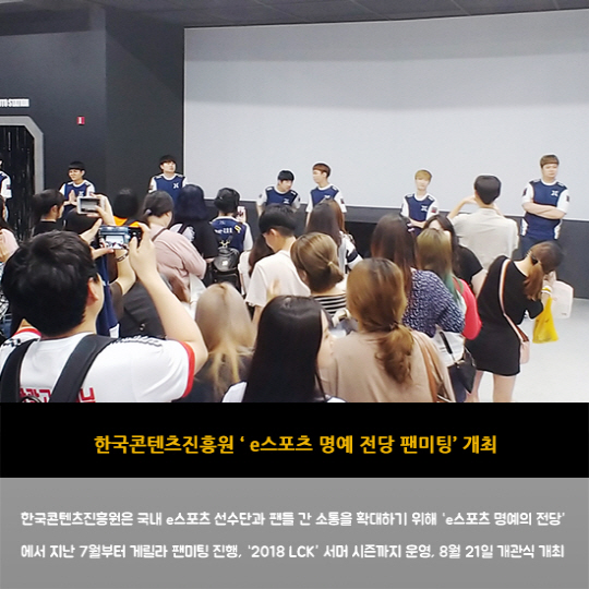 한국콘텐츠진흥원은 국내 e스포츠 선수단과 팬들 간 소통을 확대하기 위해 'e스포츠 명예의 전당'에서 지난 7월부터 게릴라 팬미팅 진행, '2018 LCK' 서머 시즌까지 운영, 8월 21일 개관식 개최